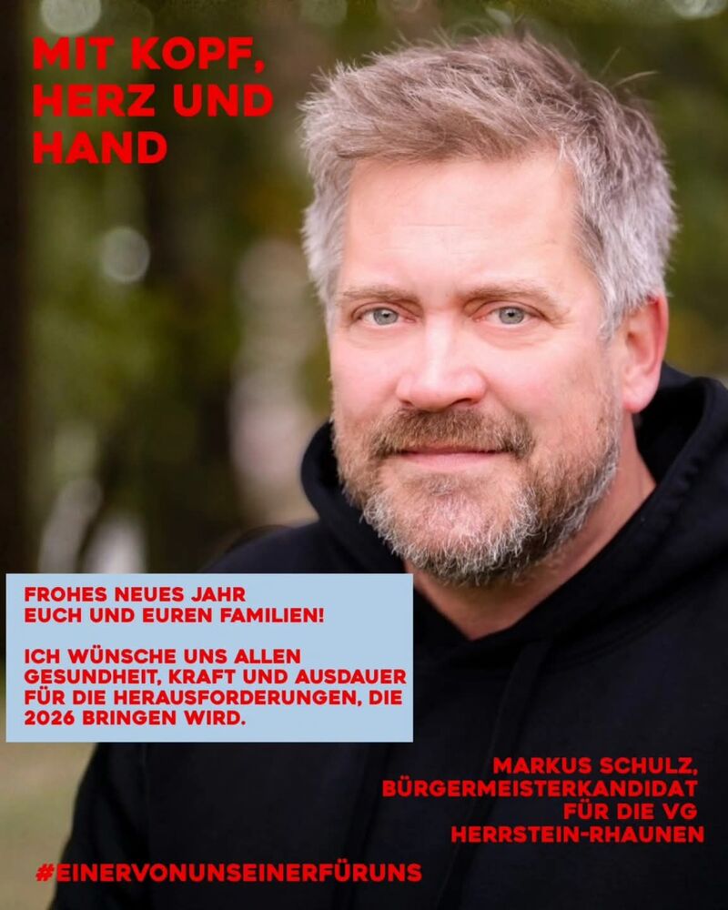 Markus wurde am 28. Mai 2025 auf der Deligiertenkonferenz des SPD Gemeindeverbandes Herrstein-Rhaunen einstimmig zum Kandidaten für die Bürgermeisterwahl in der Verbandsgemeinde Herrstein-Rhaunen (Termin: 22.03.2026) nominiert.